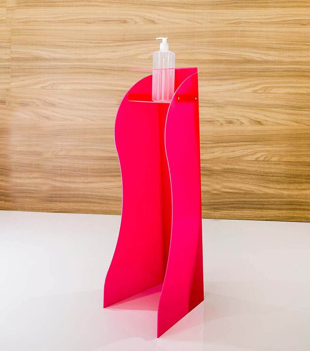 È una colonnina ad altezza mani (L20 x H85 x P32/15 cm) con alla sommità uno spazio per inserire un dispensatore di gel igienizzante.
